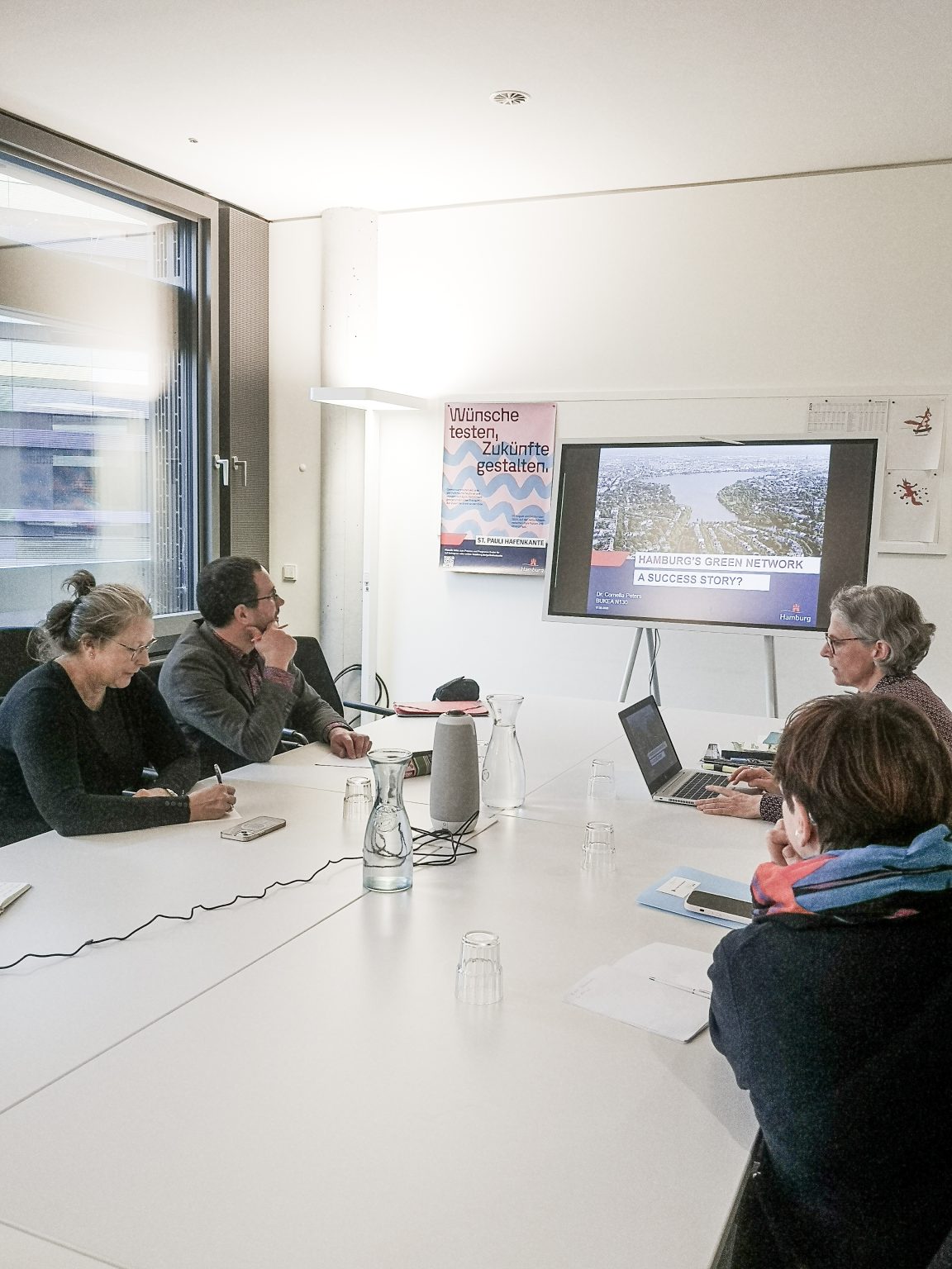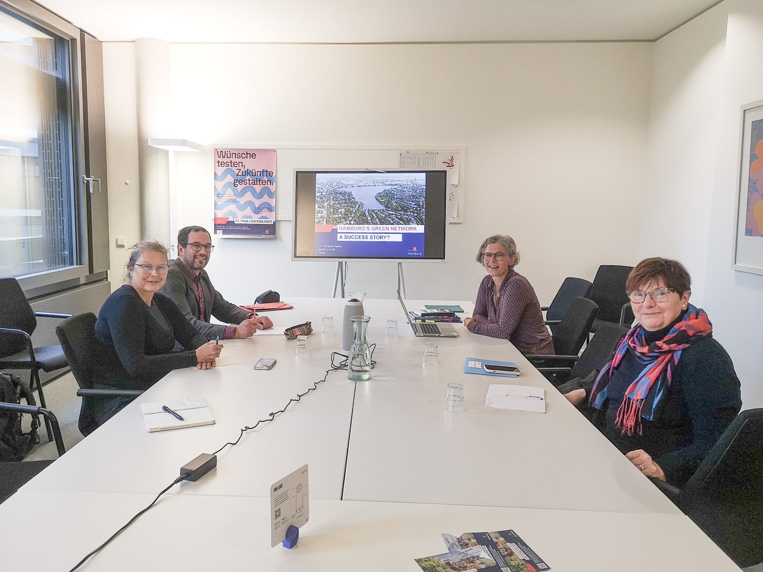 W ramach wizyty studyjnej w Hamburgu, zespół projektu: Jan Kamiński, Ewa Trzaskowska, Katarzyna Bezpalko oraz Marta Kurowska z fundacji tu obok spotyka się z przedstawicielami instytucji odpowiedzialnych za urbanistykę i zieleń w mieście.