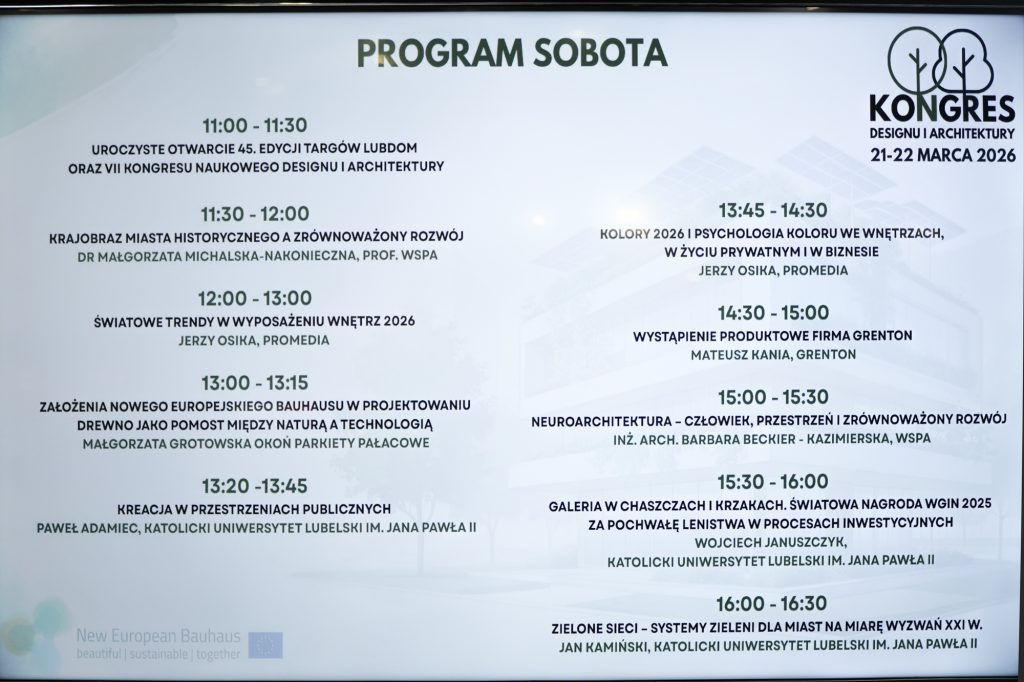 Podczas Targów Lubdom oraz Kongresu Architektury i Designu swoje wykłady zaprezentowali przedstawiciele kierunku Architektura Krajobrazu KUL: Jan Kamiński, Paweł Totoro Adamiec oraz Wojciech Januszczyk. Tematy wystąpień dotyczyły systemów zieleni dla miast wobec wyzwań XXI wieku, kreacji w przestrzeniach publicznych oraz relacji pomiędzy projektowaniem, krajobrazem i współczesnymi procesami inwestycyjnymi. Wspólnym mianownikiem prezentowanych zagadnień była idea Zielonych Sieci — rozumianych jako zintegrowane myślenie o zieleni, przestrzeni publicznej i jakości środowiska miejskiego. Wykłady ukazywały znaczenie architektury krajobrazu w tworzeniu rozwiązań odpowiadających jednocześnie na potrzeby ekologiczne, estetyczne i społeczne.